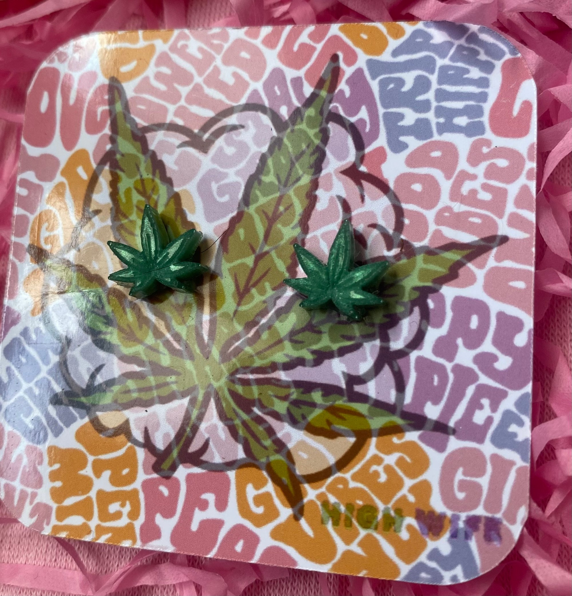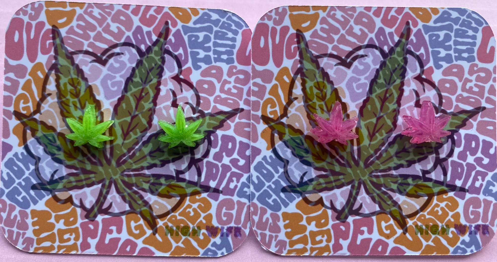 Hypoallergenic earring studs, with resin canna leaf decoration. Come with both rubber & metal backs.